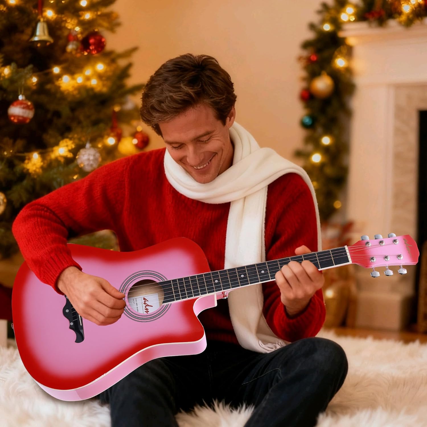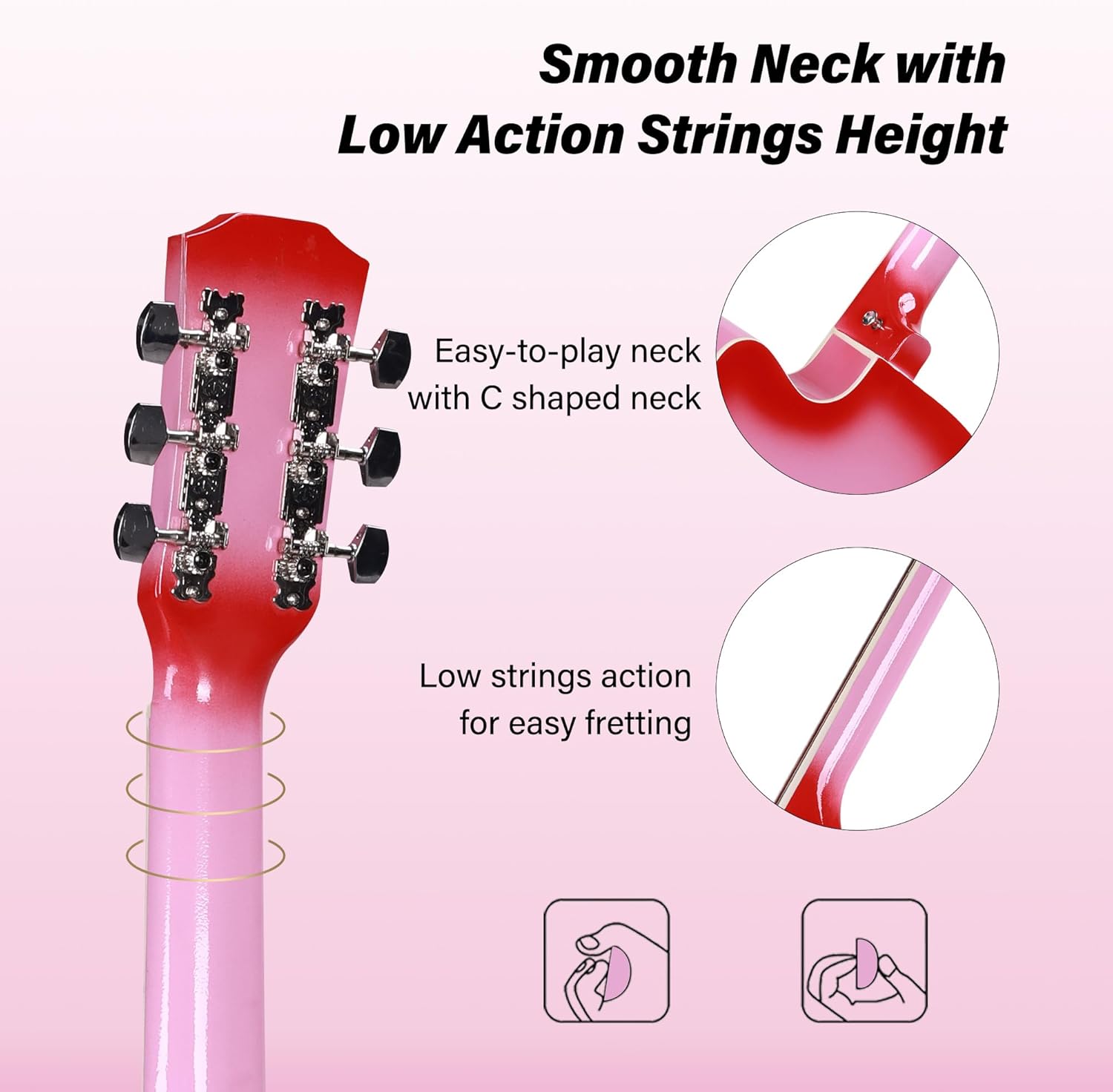 This 38 inch acoustic guitar features an oval C-shaped guitar neck that fits the curve of your palm better and is very smooth and comfortable to play.