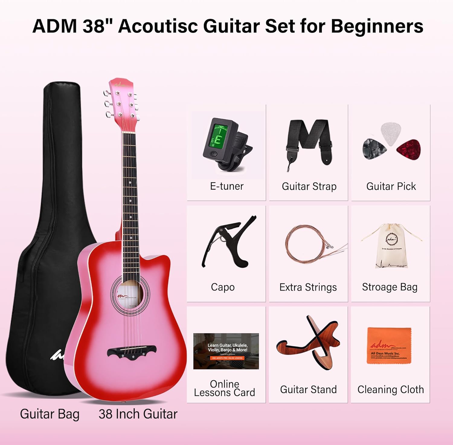 The ADM 38-inch acoustic guitar kit is excellent for beginners, budding musicians, students, and young players looking to start playing guitar. It includes everything you need to start playing straight out of the box.