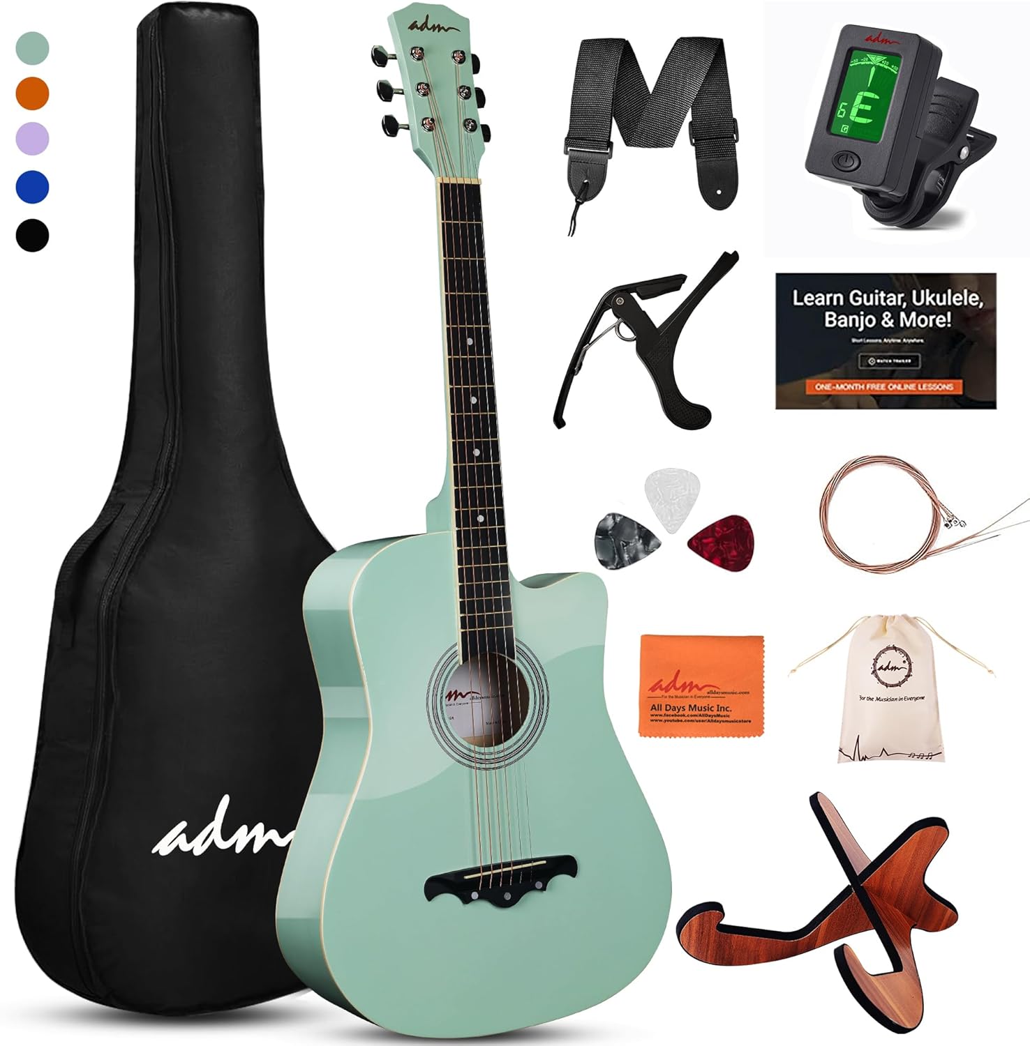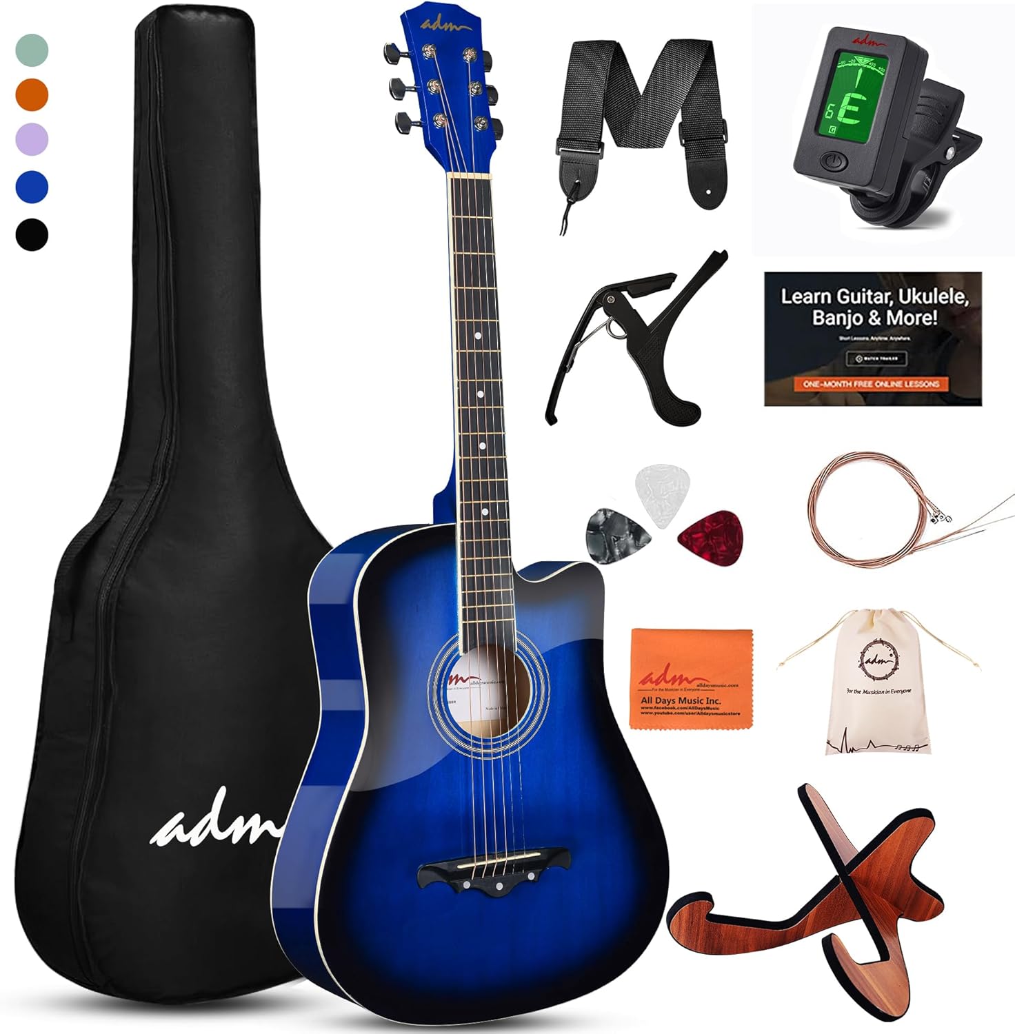 Perfect for beginner students and coms with a case, picks, shoulder strap, digital E-tuner, capo, guitar stand and extra replacement strings etc.